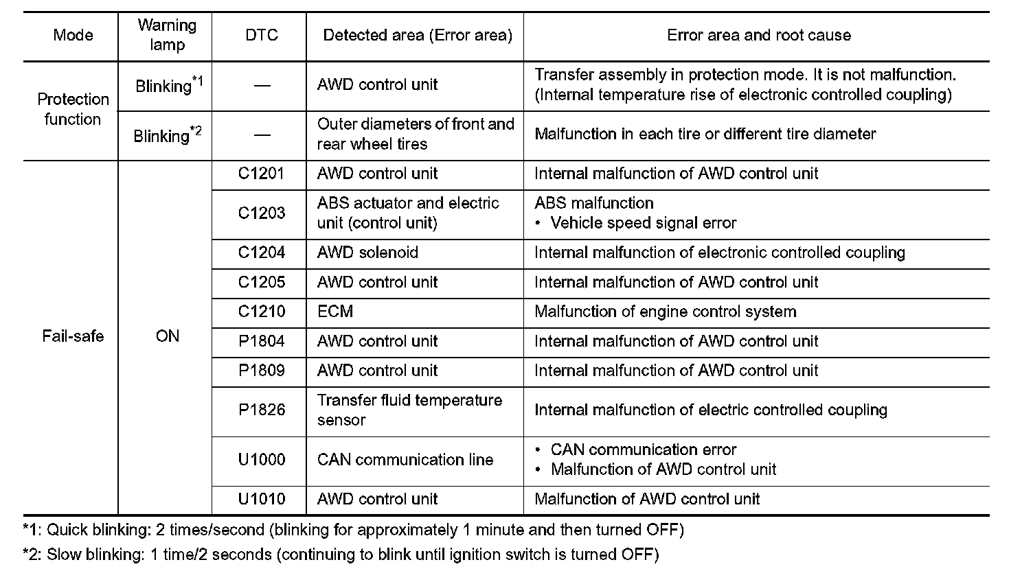 - When AWD warning lamp is ON, vehicle changes to rear-wheel drive or shifts to 4-wheel drive (front-wheels still have some driving torque).