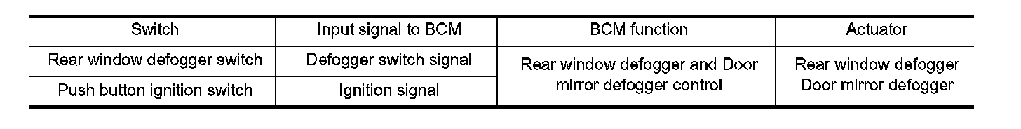 - BCM turns rear window defogger relay ON for approximately 15 minutes when rear window defogger switch turns ON. It makes rear window defogger and door mirror defogger (with mirror defogger) operate.