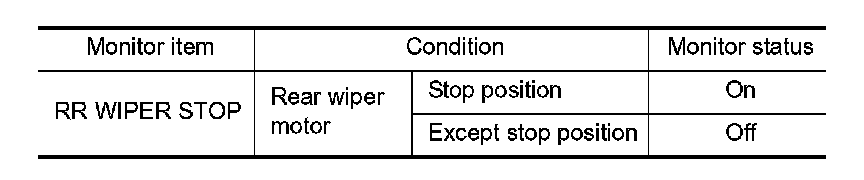 3. Check that "RR WIPER STOP" changes to "On" and "Off" linked with the wiper operation.