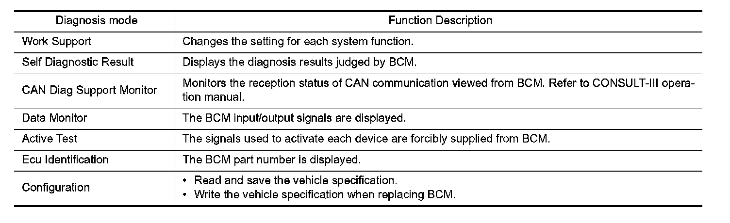 CONSULT-III performs the following functions via CAN communication with BCM.