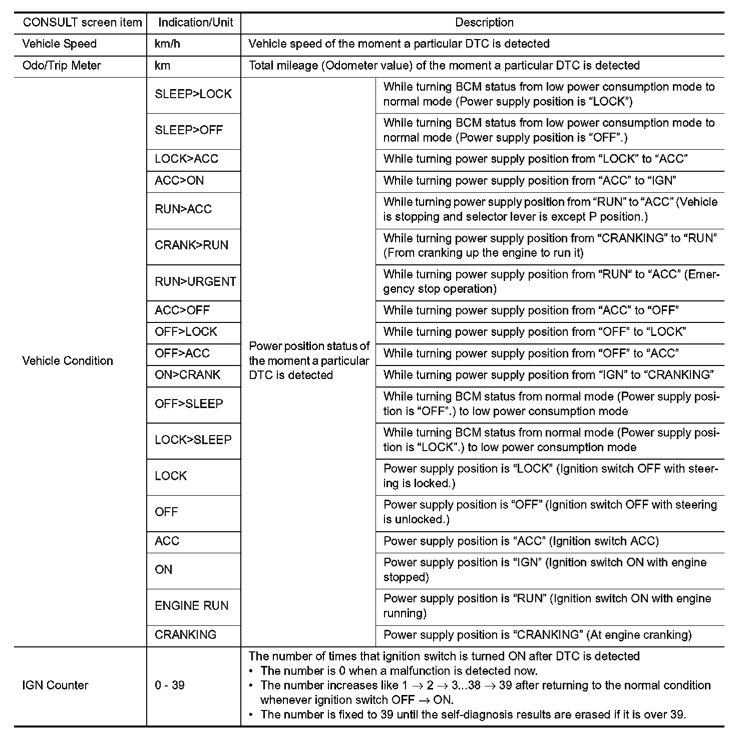 The BCM records the following vehicle condition at the time a particular DTC is detected, and displays on
