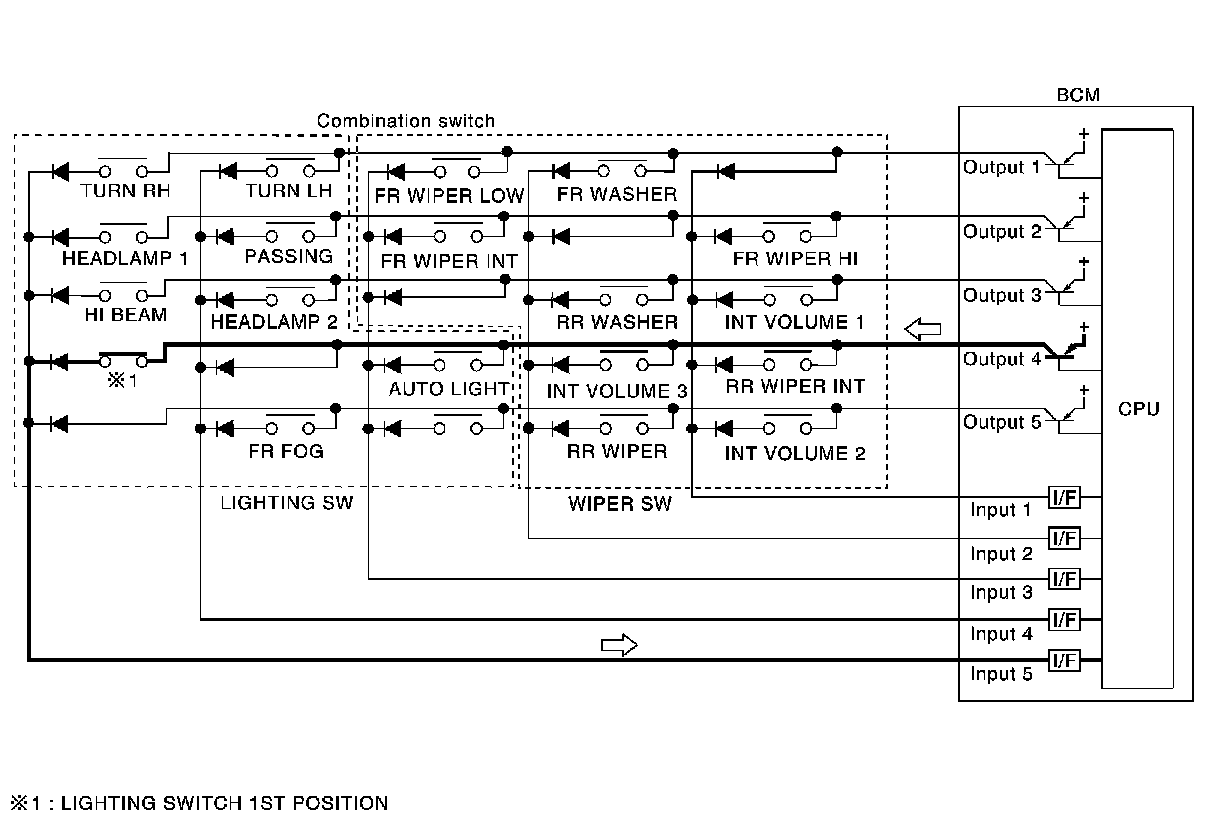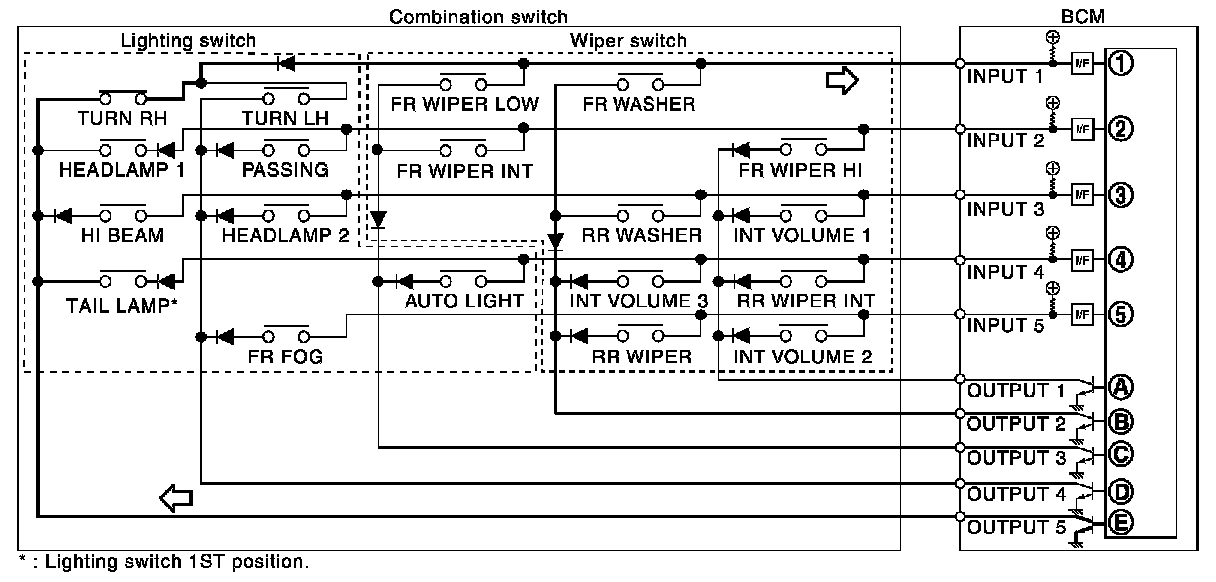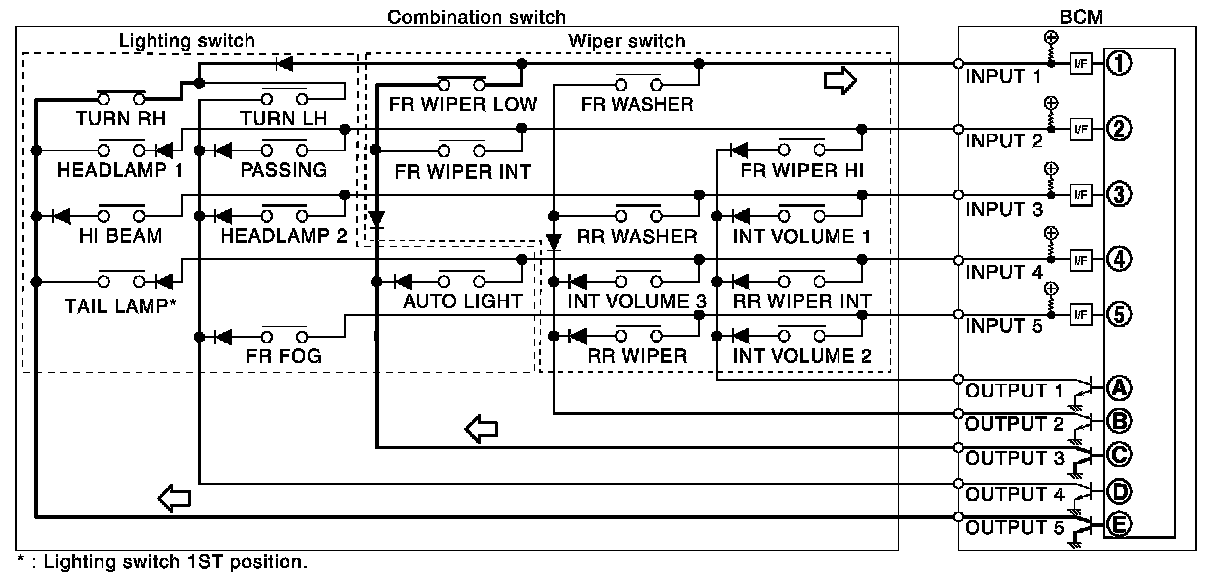 - BCM detects the combination switch status signal "1E" when the signal of OUTPUT 5 is input to INPUT 1.