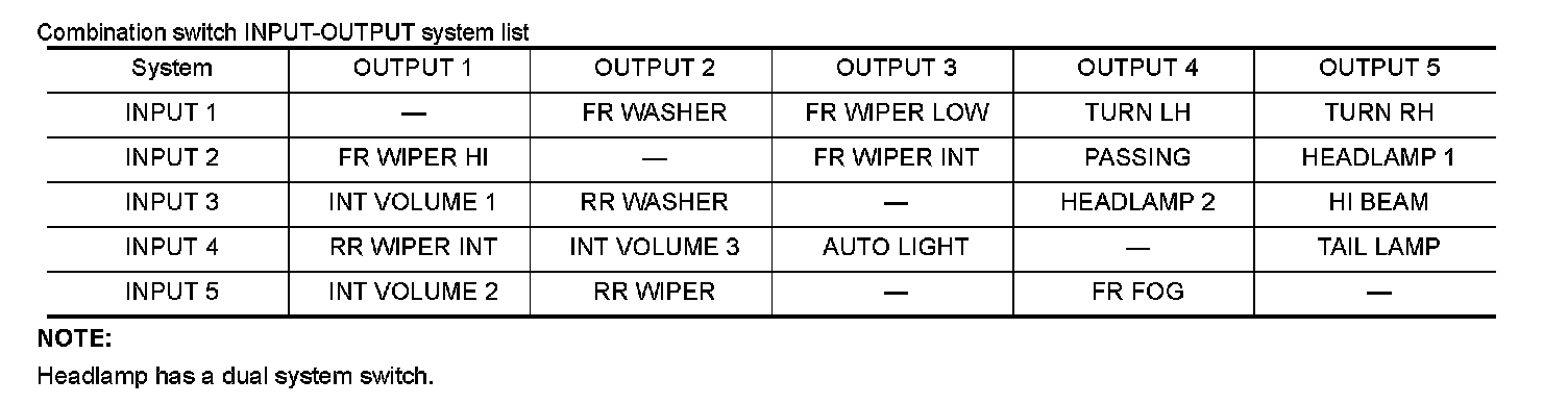 - BCM detects the combination switch status signal "1CE" when the signals of OUTPUT 3 and OUTPUT 5 are input to INPUT 1.