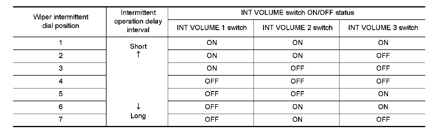 BCM judges the wiper intermittent dial 1 - 7 by the status of INT VOLUME 1, 2 and 3 switches.