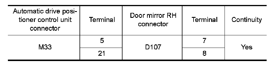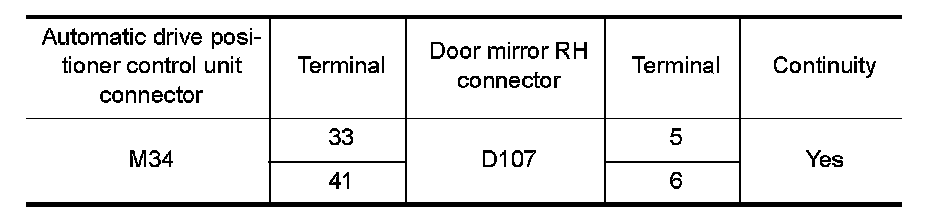 1. Check continuity between automatic drive positioner control unit harness connector and door mirror RH harness connector.