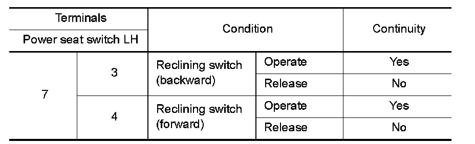 3. Check continuity between power seat switch LH terminals.