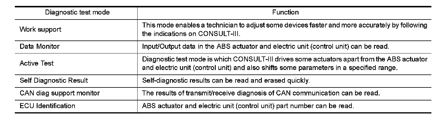 CONSULT-III can display each diagnostic item using the diagnostic test modes shown following.