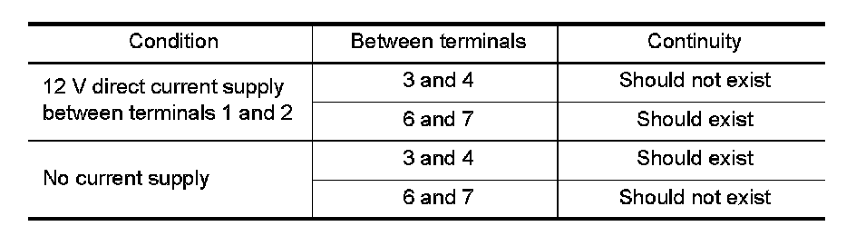 2. Check continuity between relay terminals 3 and 4, 6 and 7 under the following conditions.