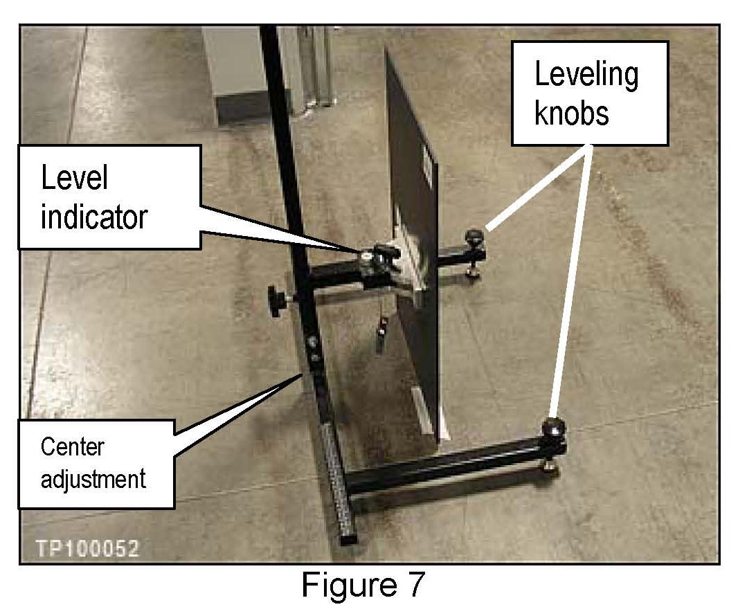 ^ Bring the bubble into the center of the level indicator by turning the knobs on the support base legs.