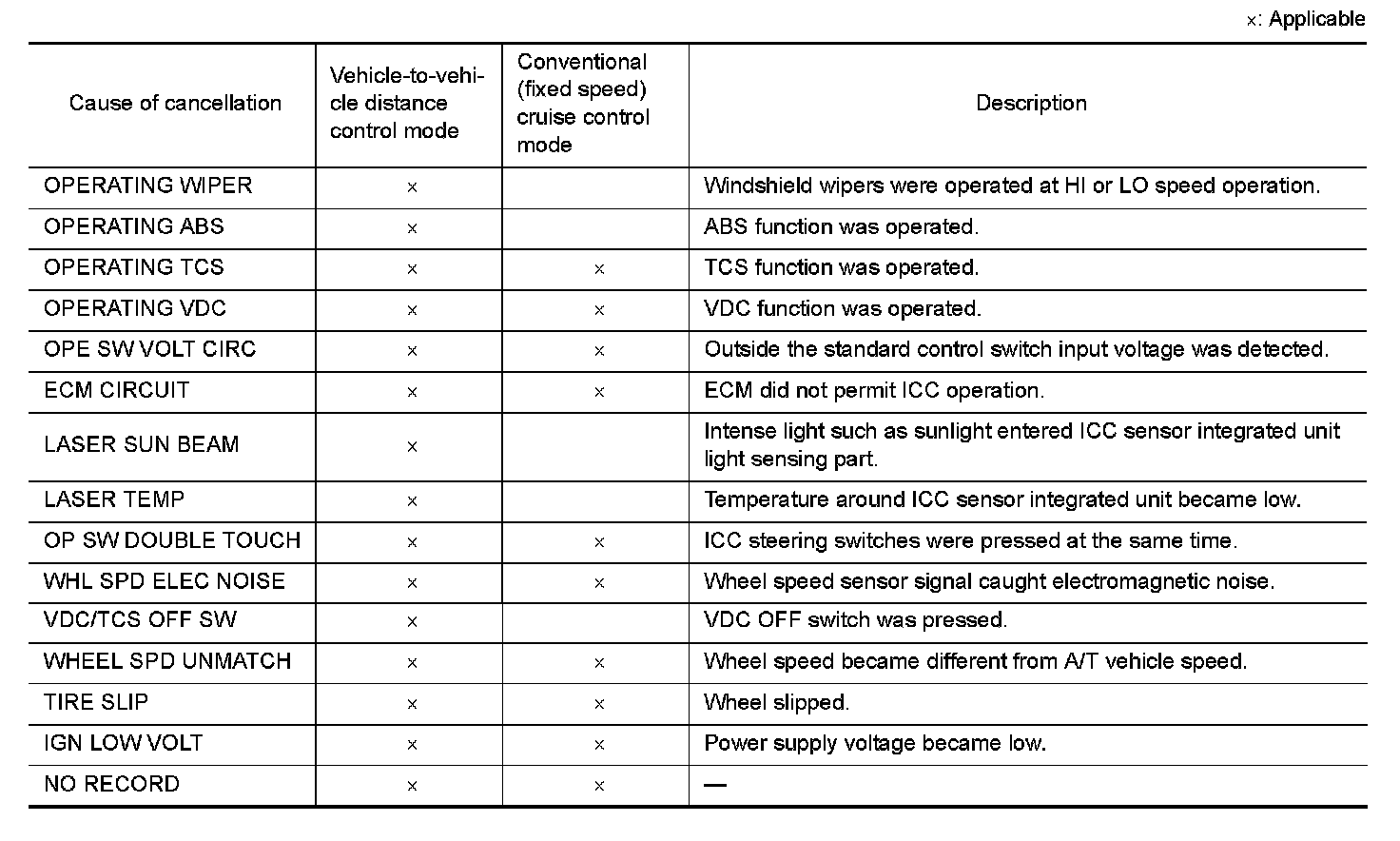 - "CAUSE OF AUTO-CANCEL" displays times of ignition switch ON/OFF up to 254 maximum. 254 is kept though the number exceeds 254. The number returns to 0 when detecting the same cancellation causes.