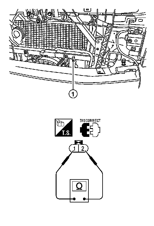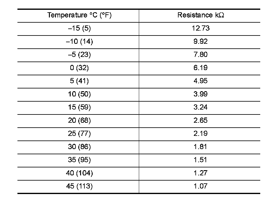After disconnecting ambient sensor (1) connector E1, measure resistance between terminals 1 and 2 at sensor component side, using the table below.