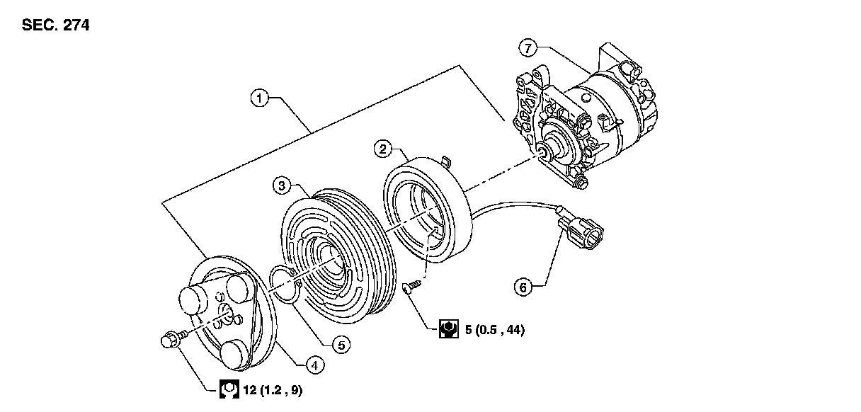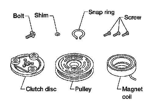 When replacing compressor clutch assembly, always conduct the break-in operation. This is done by engaging and disengaging the clutch about 30 times. Break-in operation raises the level of transmitted torque.