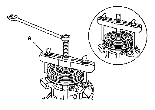 2. Remove the center bolt while holding the clutch disc stationary using Tool as shown.