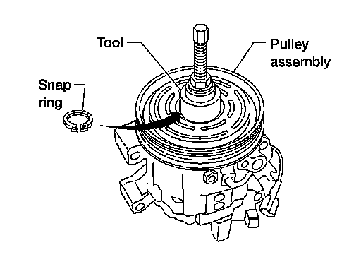 2. Install the pulley assembly using Tool and a wrench, then install the snap ring using a suitable tool.