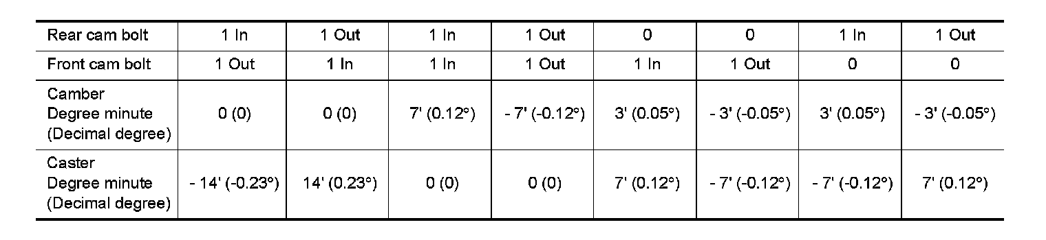 Camber changes about 3' (0.05�) minutes with each graduation of one cam bolt. Refer to table below for examples of lower link cam bolt effect on camber and caster.