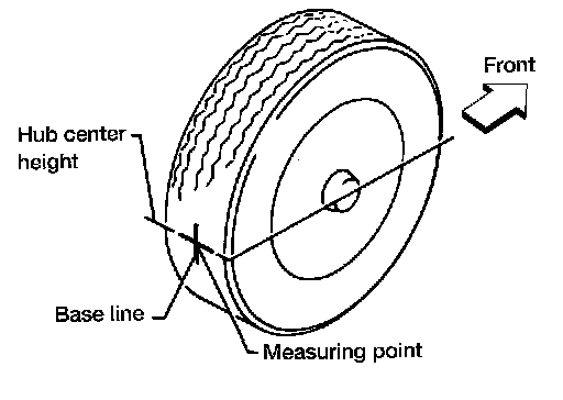 3. Put a mark on base line of the tread (rear side) of both front tires at the same height as hub center as shown. These marks are measuring points.