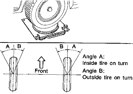 6. Measure the distance (B) on the front side of the front tires at the same marks as shown. Total toe-in is calculated as (A � B).