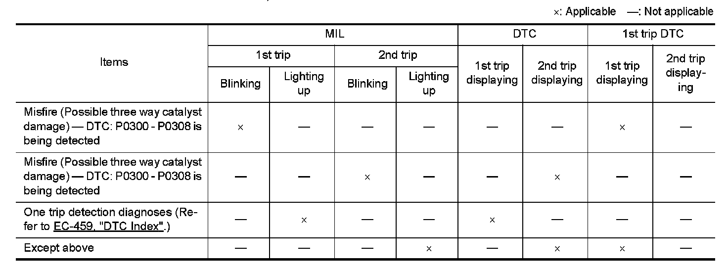 If the same malfunction is detected again during the next drive, the DTC and Freeze Frame data are stored in the ECM memory, and the MIL lights up. The MIL lights up at the same time when the DTC is stored. [2nd trip] The "trip" in the "Two Trip Detection Logic" means a driving mode in which self-diagnosis is performed during vehicle operation. Specific on board diagnostic items will cause the ECM to light up or blink the MIL, and store DTC and Freeze Frame data, even in the 1st trip, as shown below.