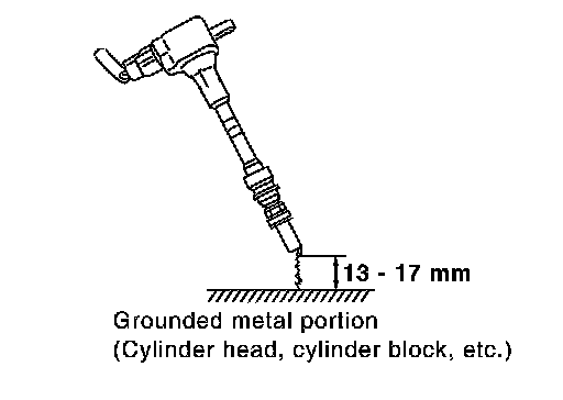 15. Fix ignition coil using a rope etc. with gap of 13 - 17 mm (0.52 -0.66 in) between the edge of the spark plug and grounded metal portion as shown in the figure.