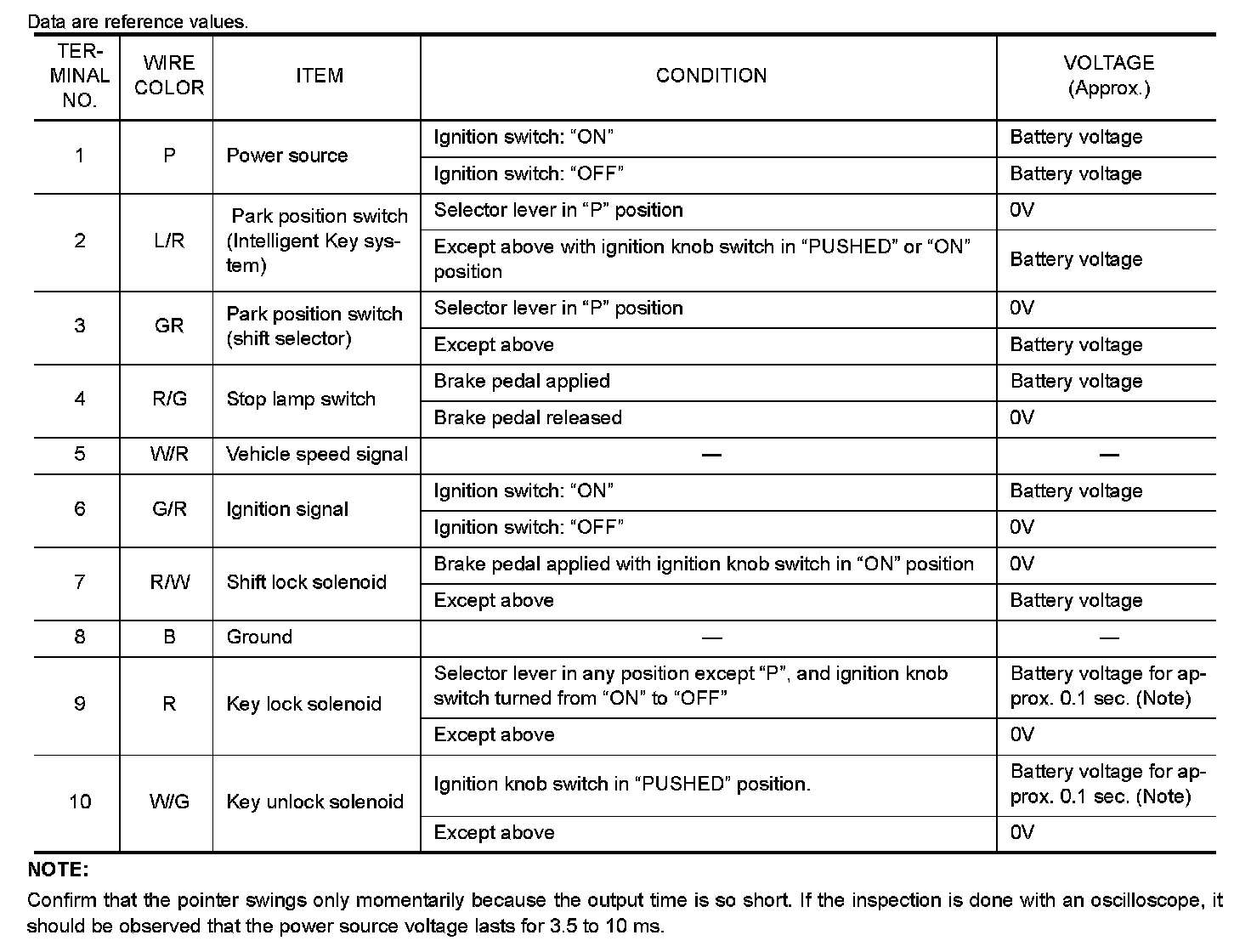 SHIFT LOCK HARNESS CONNECTOR TERMINALS LAYOUT