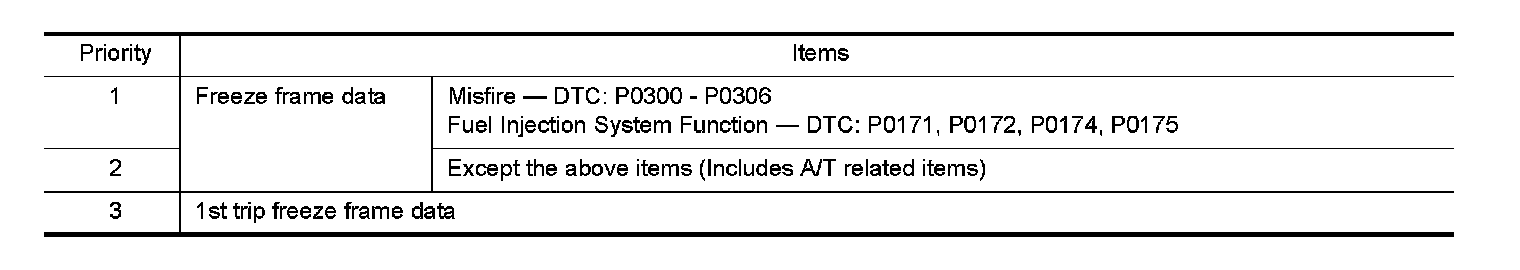 Only one set of freeze frame data (either 1st trip freeze frame data of freeze frame data) can be stored in the ECM. 1st trip freeze frame data is stored in the ECM memory along with the 1st trip DTC. There is no priority for 1st trip freeze frame data and it is updated each time a different 1st trip DTC is detected. However, once freeze frame data (2nd trip detection/MIL on) is stored in the ECM memory, 1st trip freeze frame data is no longer stored. Remember, only one set of freeze frame data can be stored in the ECM. The ECM has the following priorities to update the data.