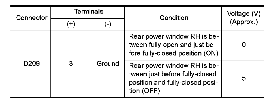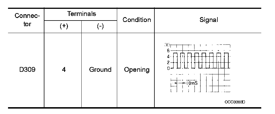 2. Check the signal between rear power window control unit RH connector D309 terminal 4 and ground with oscilloscope.