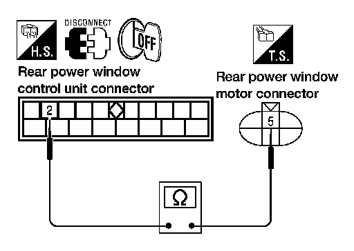 2. Check continuity between rear power window motor RH connector D304 terminal 6 and ground.