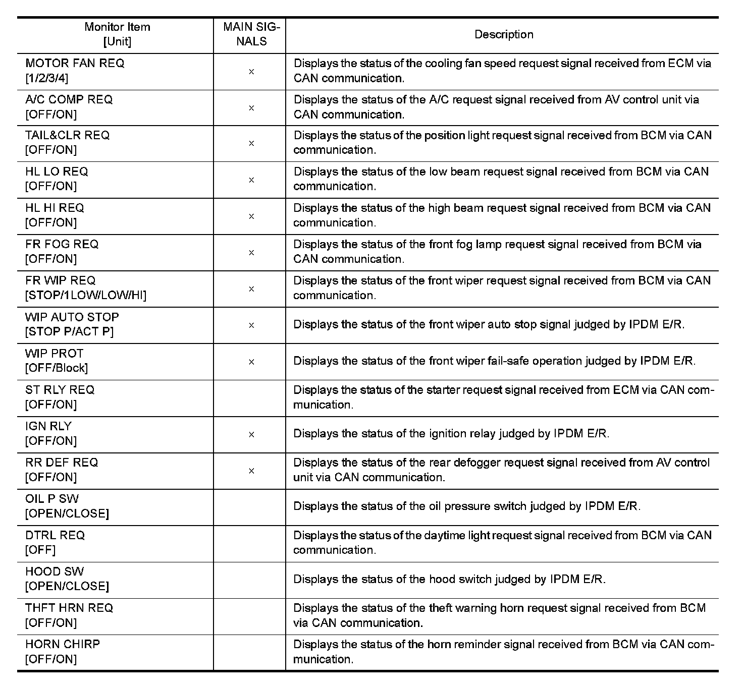 CONSULT-III performs the following functions via CAN communication with IPDM E/R.