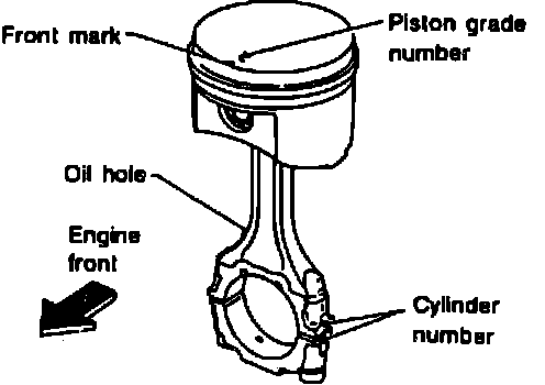 1. Install new snap ring on one side of piston pin hole, heat piston to 140-158°F and assemble piston, pin connecting rod and snap ring.