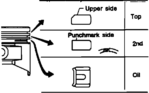 5. Set piston rings as shown in Fig. 32. When piston rings are not replaced, ensure piston rings are mounted in their original positions. If piston rings are being replaced and no punchmark is present, rings can be mounted with either side up.