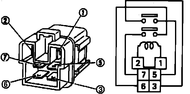 4. Apply battery voltage between terminal 1 and 2, then check continuity between terminals 3 and 5, then terminals 6 and 7. Continuity should exist.
