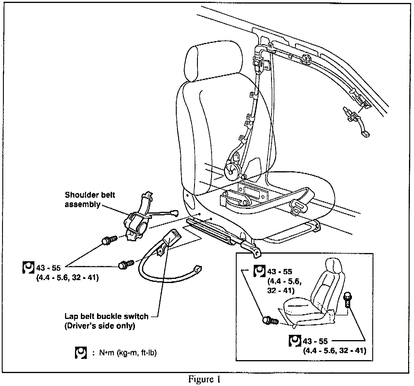5. Hand tighten the bolts for the seat track, shoulder belt and seat belt buckle to assure proper alignment. Torque to the specifications shown in Figure 1.