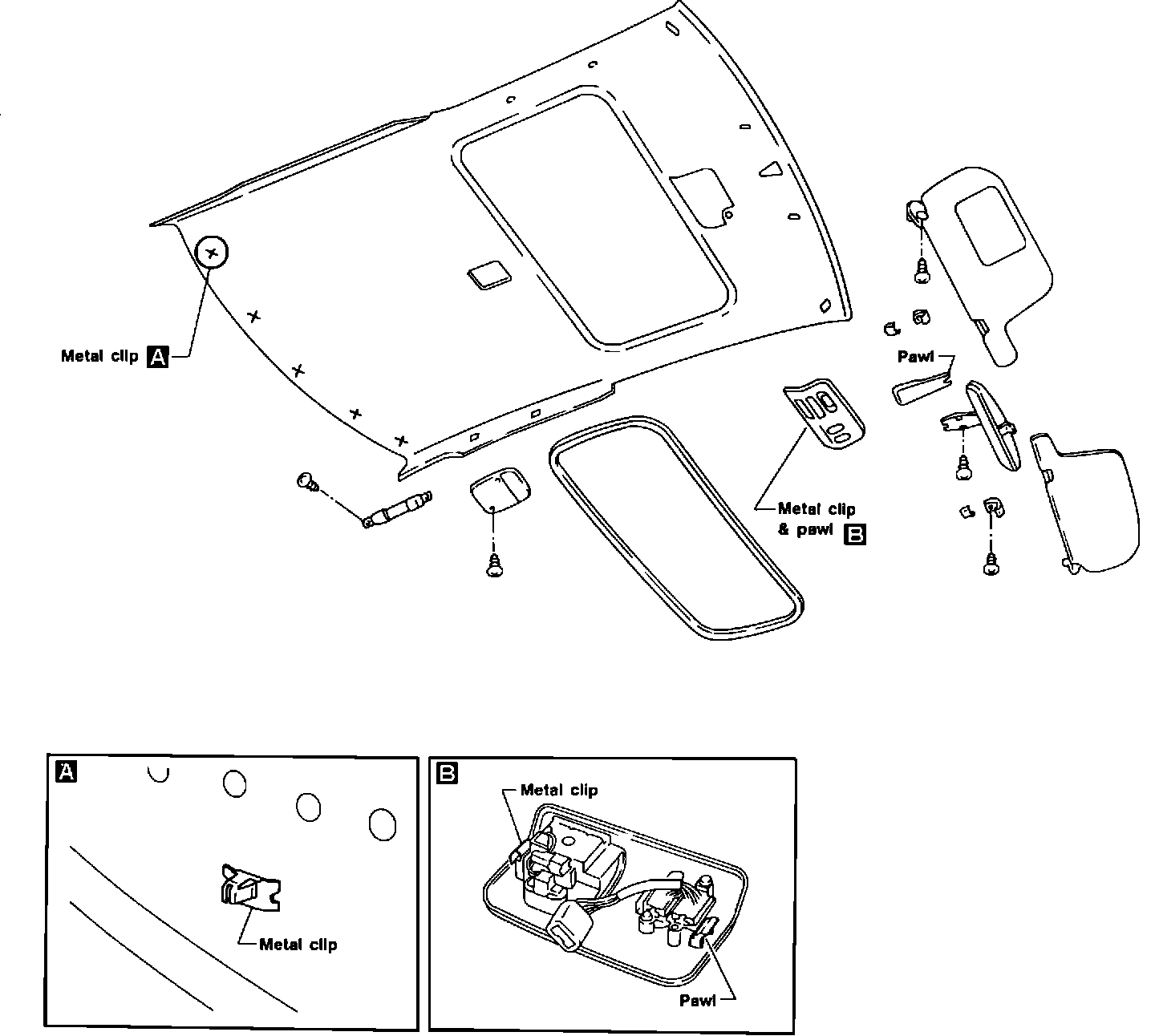 A. Remove sunvisor, assist straps, room lamps, and inside mirror.