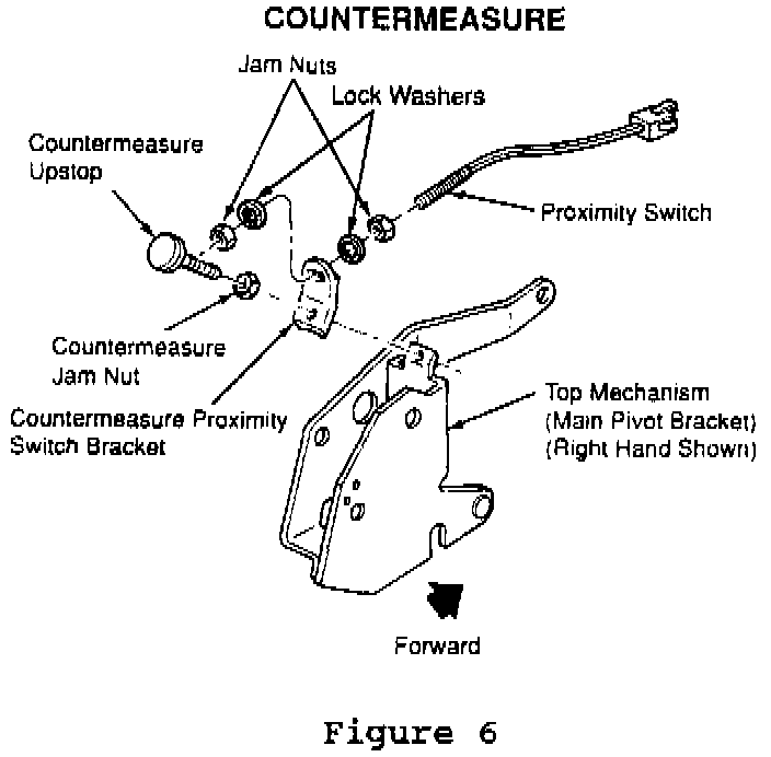 2. Position the countermeasure proximity switch bracket to the convertible top mechanism and install the countermeasure upstop. Bottom out the upstop on the proximity switch bracket (Figure 6).
