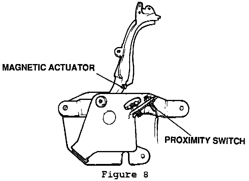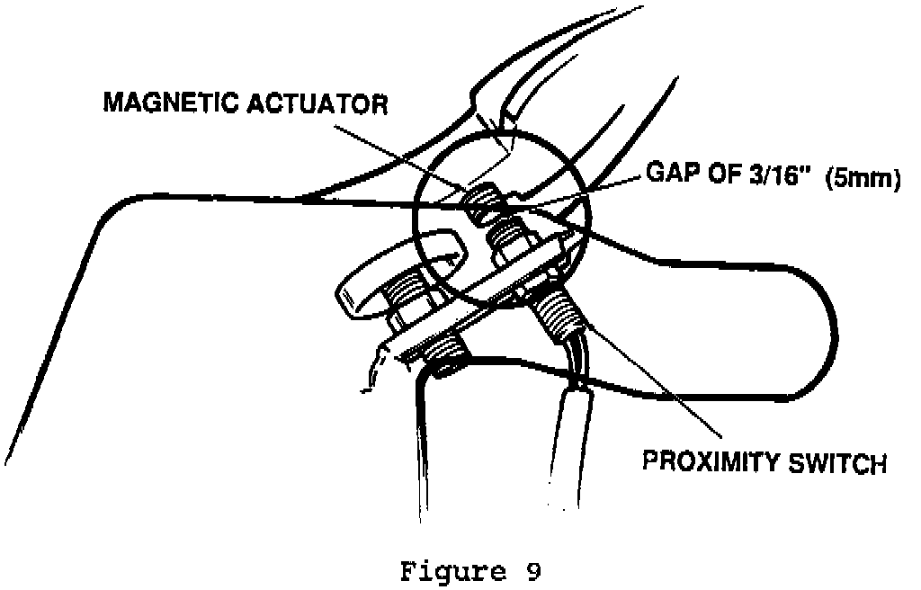 28. Adjust the proximity switch so that the clearance between the proximity switch and the magnetic actuator in the rear rail is 3/16" (5 mm). (Figure 9)