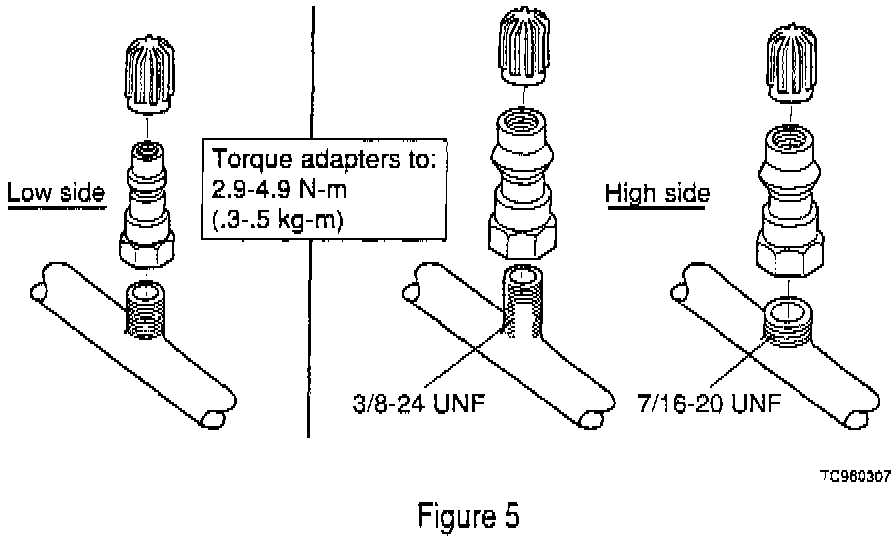 There are two types of high pressure service valves 7/16-20 UNF and 3/8-24 UNF. Both sizes of adapters are included in the retrofit kit. Install the correct adapter after confirming the service valve configuration.