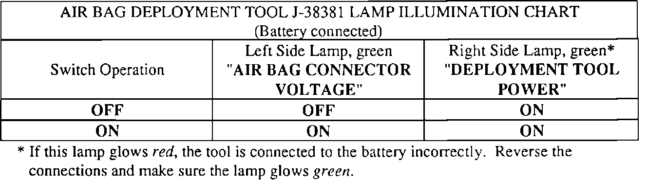 AIR BAG DEPLOYMENT TOOL J-38381 LAMP ILLUMINATION CHART