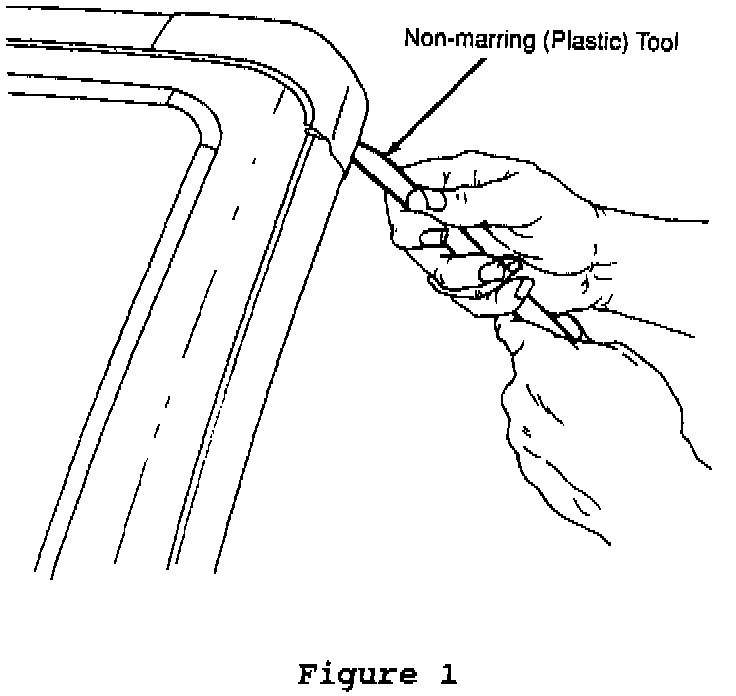 1. Lower the convertible top to the down position.2. Using a suitable, non-marring (ie: plastic) flat-bladed tool, pry up the header molding end cap along the bottom leading edge that mates with the A-Pillar retainer (Figure 1).