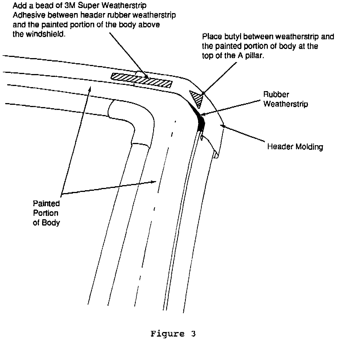6. Place butyl between the weatherstrip and the painted portion of the body at the top of the A-Pillar (see Figure 3).