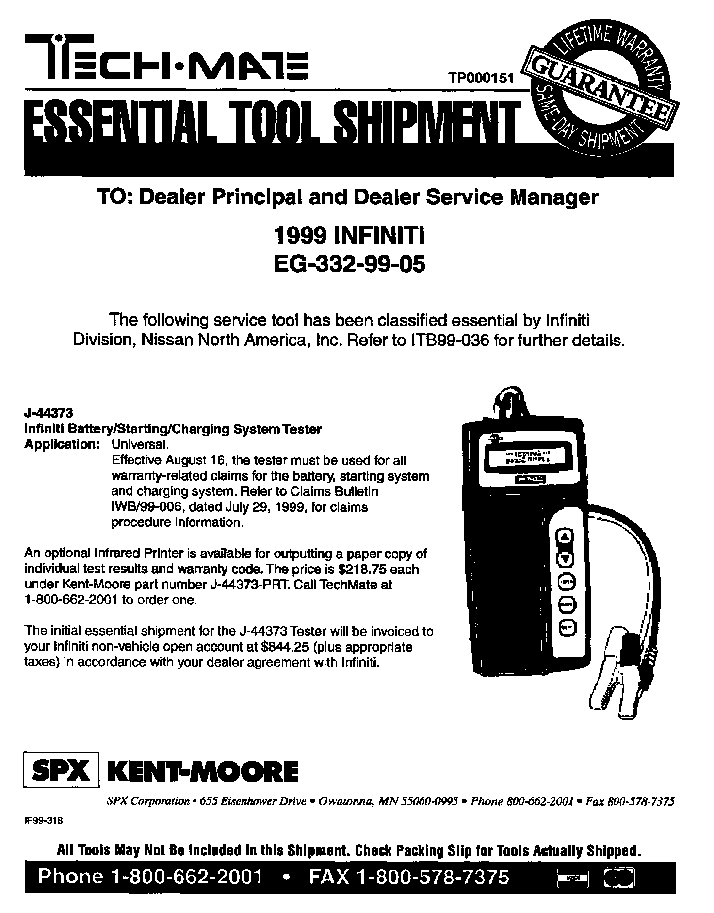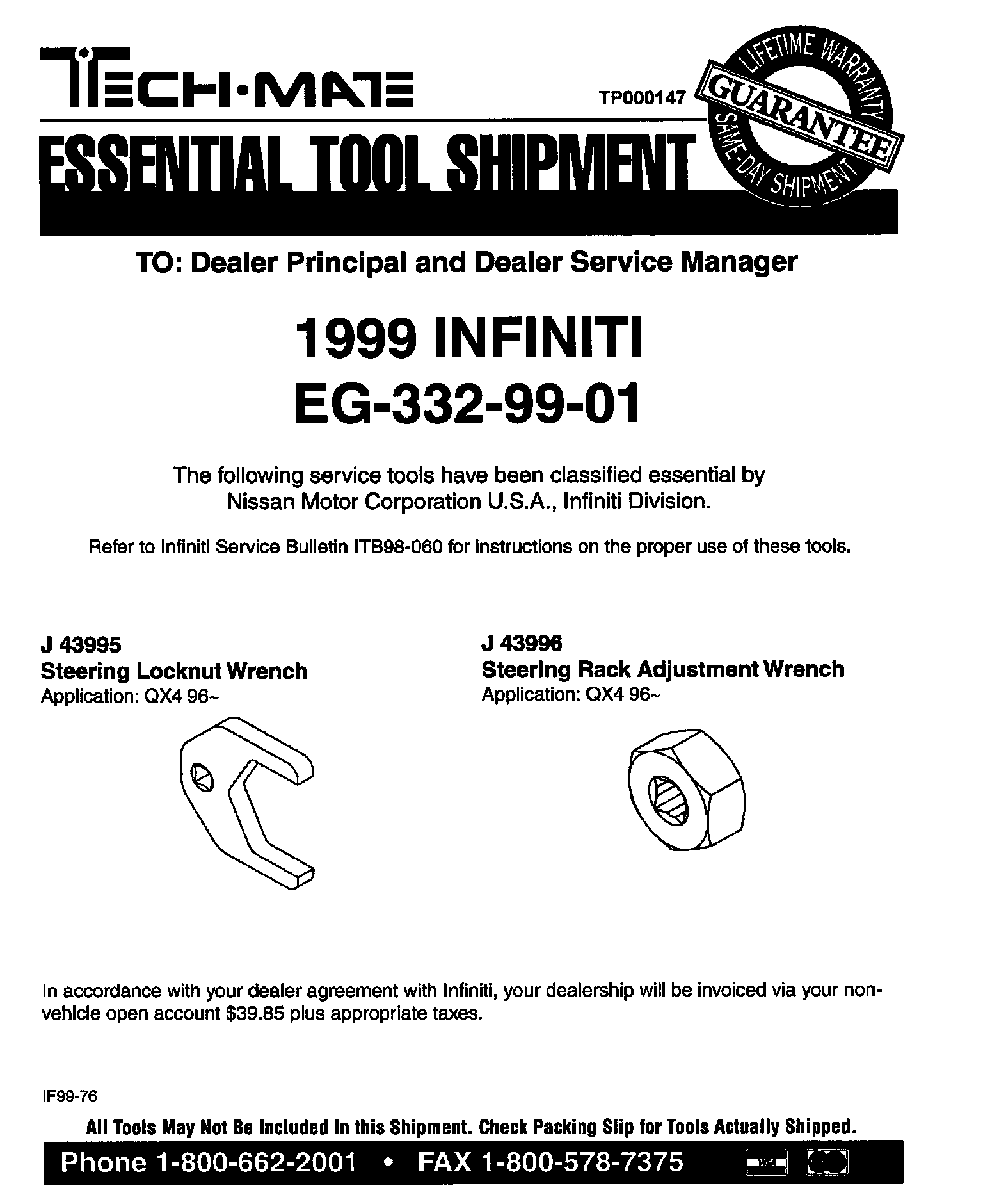 INFINITI 1999 ESSENTIAL TOOL SHIPMENT SUMMARY
