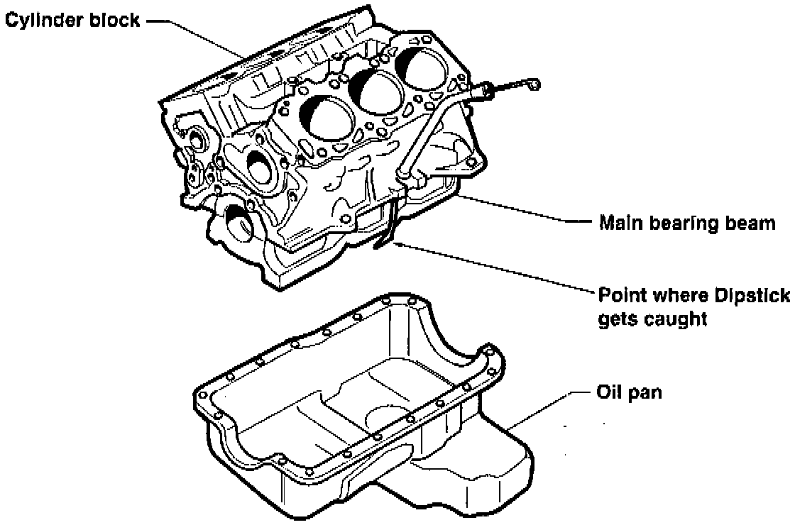 When performing any service that requires removal of the oil pan, always remove the dip stick before replacing the oil pan. If the dip stick is left in the engine the end of it may become caught between the main bearing beam and the windage tray of the oil pan. The only way to remove the dip stick after it has been caught is to remove the oil pan.