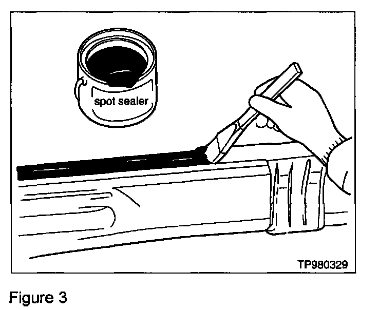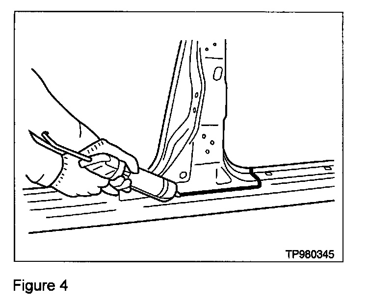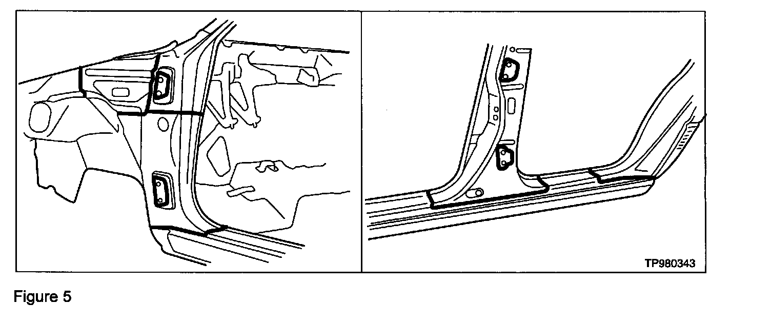 Use of body (seam) sealer (such as Fusor #800 Seam Sealer or equivalent - check with local VOC regulations) prior to base coat application aids in the appearance of the repair. It is also important for proper corrosion protection (see Figures 4, 5 & 6). Seam sealer helps prevent water or mud from entering between panel joints and it also helps prevent the formation of corrosion. Please refer to the proper Infiniti Body Repair Manual for seam sealer application points.