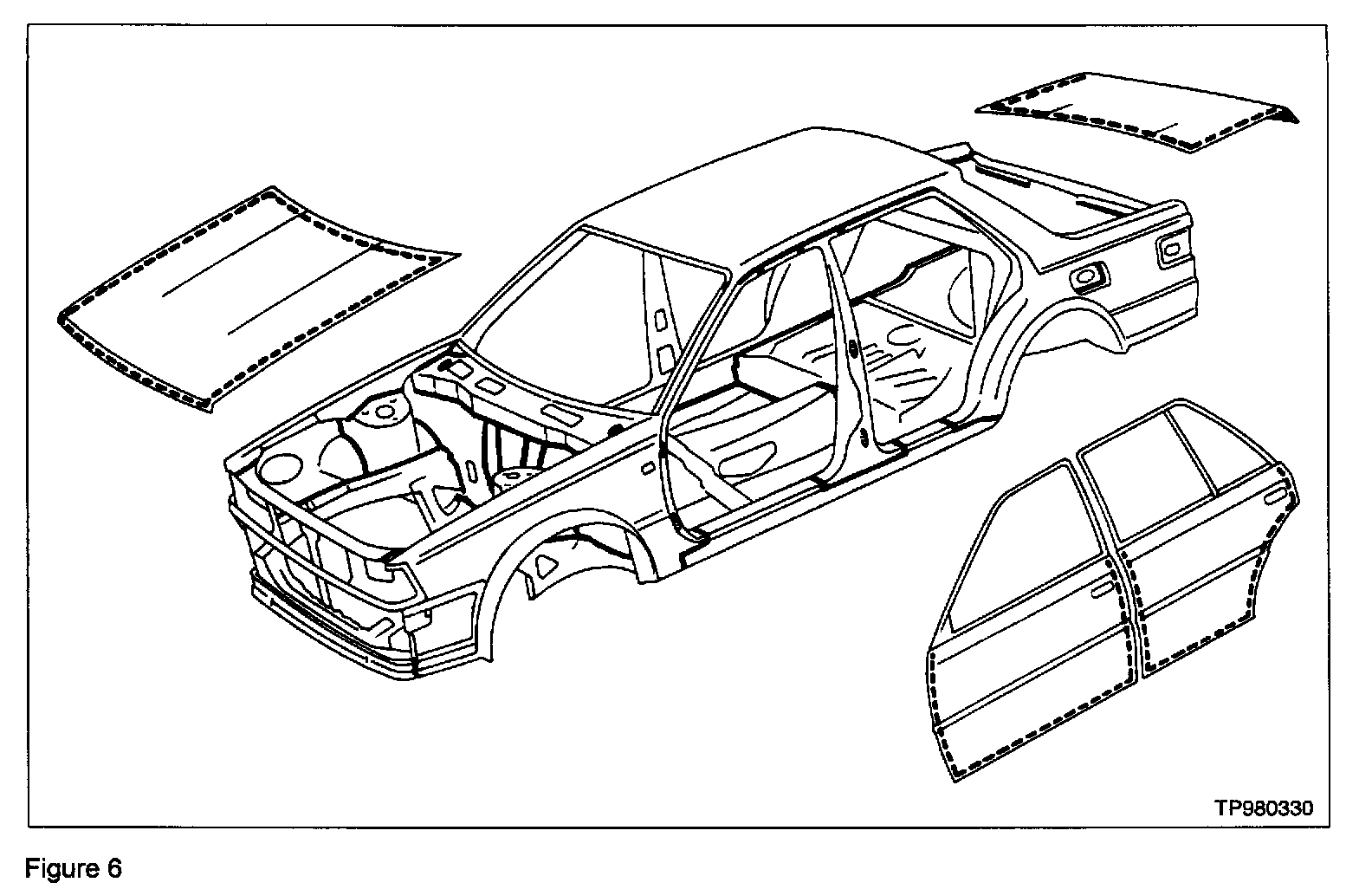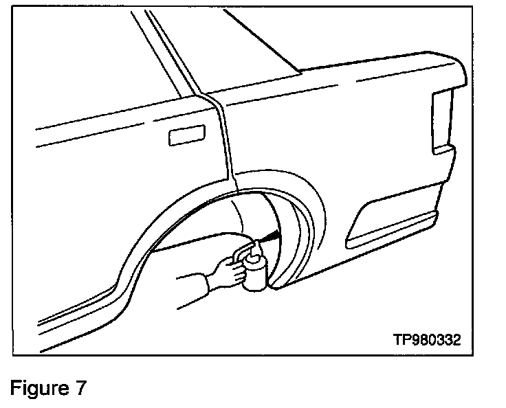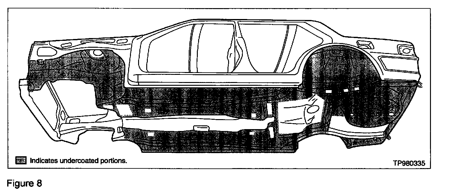 Undercoating (such as 3M Rubberized Undercoating #08883 or equivalent - check with local VOC regulations) is an elastic coating applied to the underbody (see Figures 7 & 8). This undercoating helps prevent rust, and it also reduces body vibration and noise. If the undercoating is removed during body repair, it must be reapplied to the same areas. Pay attention to critical areas such as body seams and panel joints.