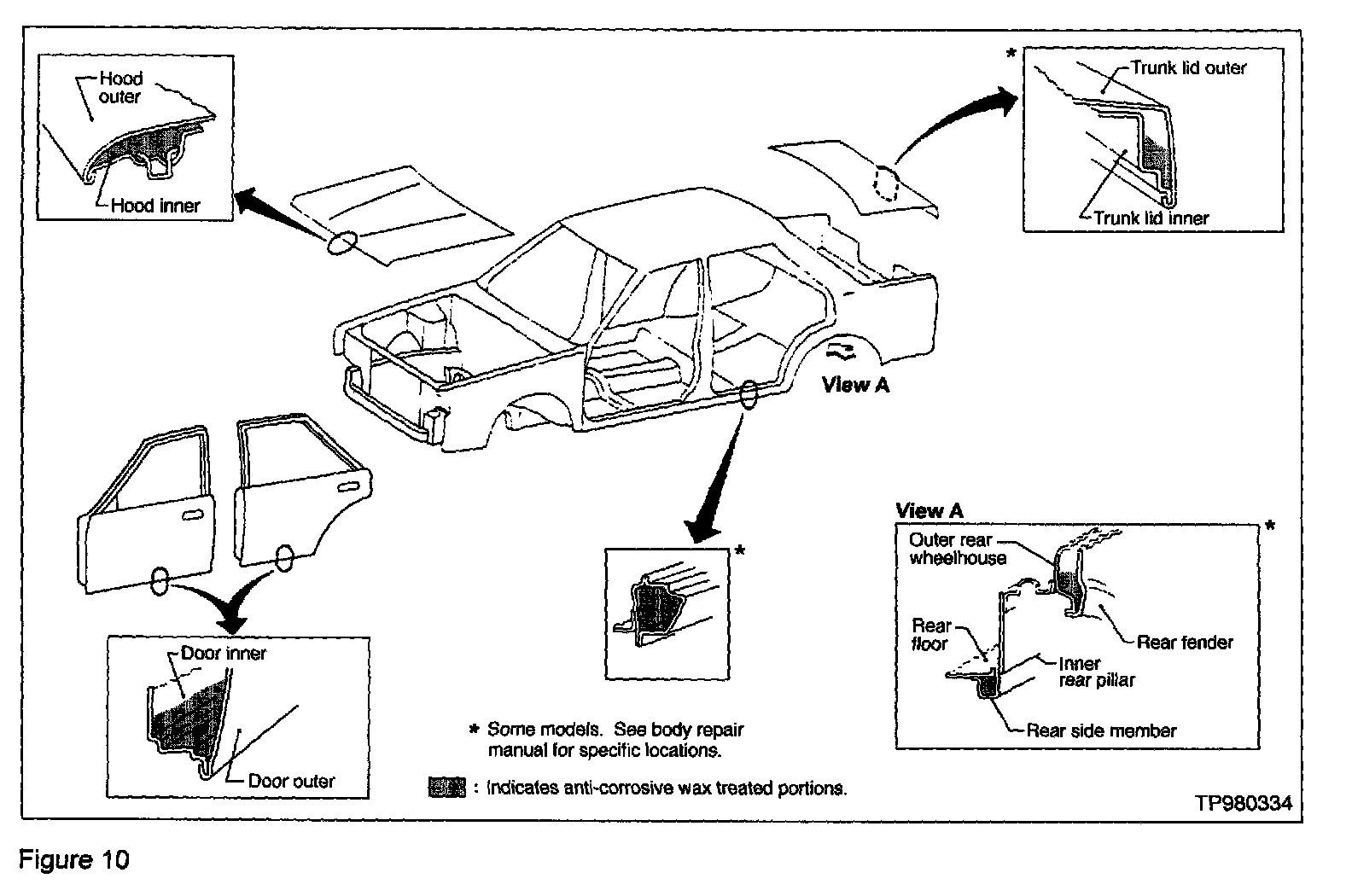 The Factory applies wax to various areas of the vehicle to prevent corrosion/perforation. Below is an example of the different body locations where wax is applied (see Figure 10).