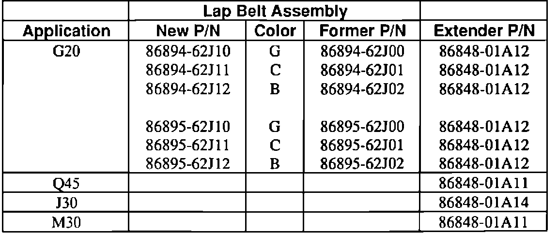 This bulletin provides a listing of part numbers and applications for Seat Belt Extenders. The Seat Belt Extenders are intended for use by customers who cannot attach the standard seat belts due to body size or driving position. vehicles which are equipped with Front Passive Seat Belts (Motorized Shoulder Belts) require the replacement of the Lap Belt Assembly for Seat Belt Extender use. The new part has a slightly revised tongue to fit into the Seat Belt Extender. Both sides may be replaced to give the customer the option of using the Seat Belt Extender on either side of the vehicle.