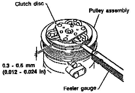 ^ Check clearance around the entire periphery of clutch disc. Disc-to-pulley clearance: 0.3 - 0.6 mm (0.012 - 0.024 in)