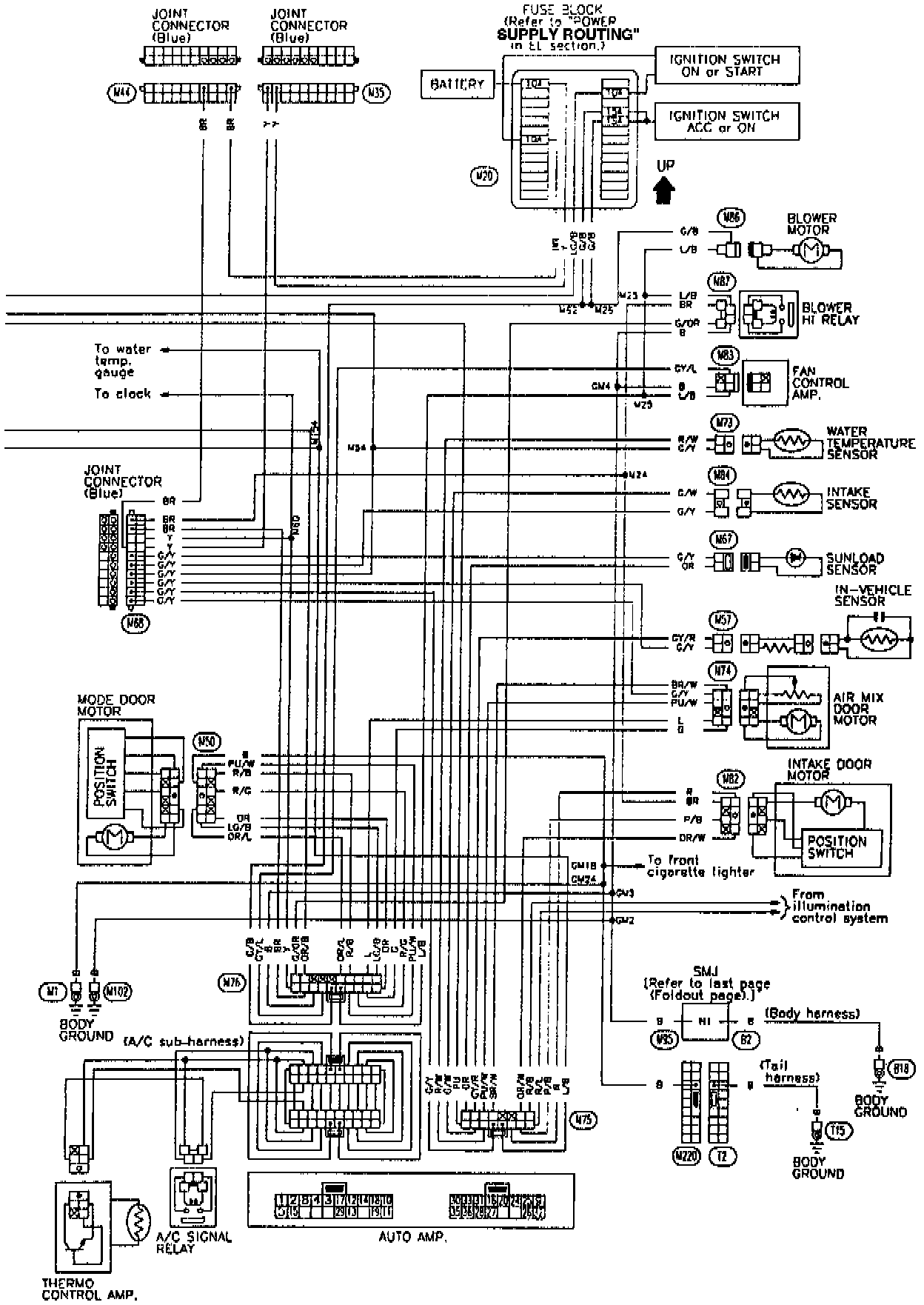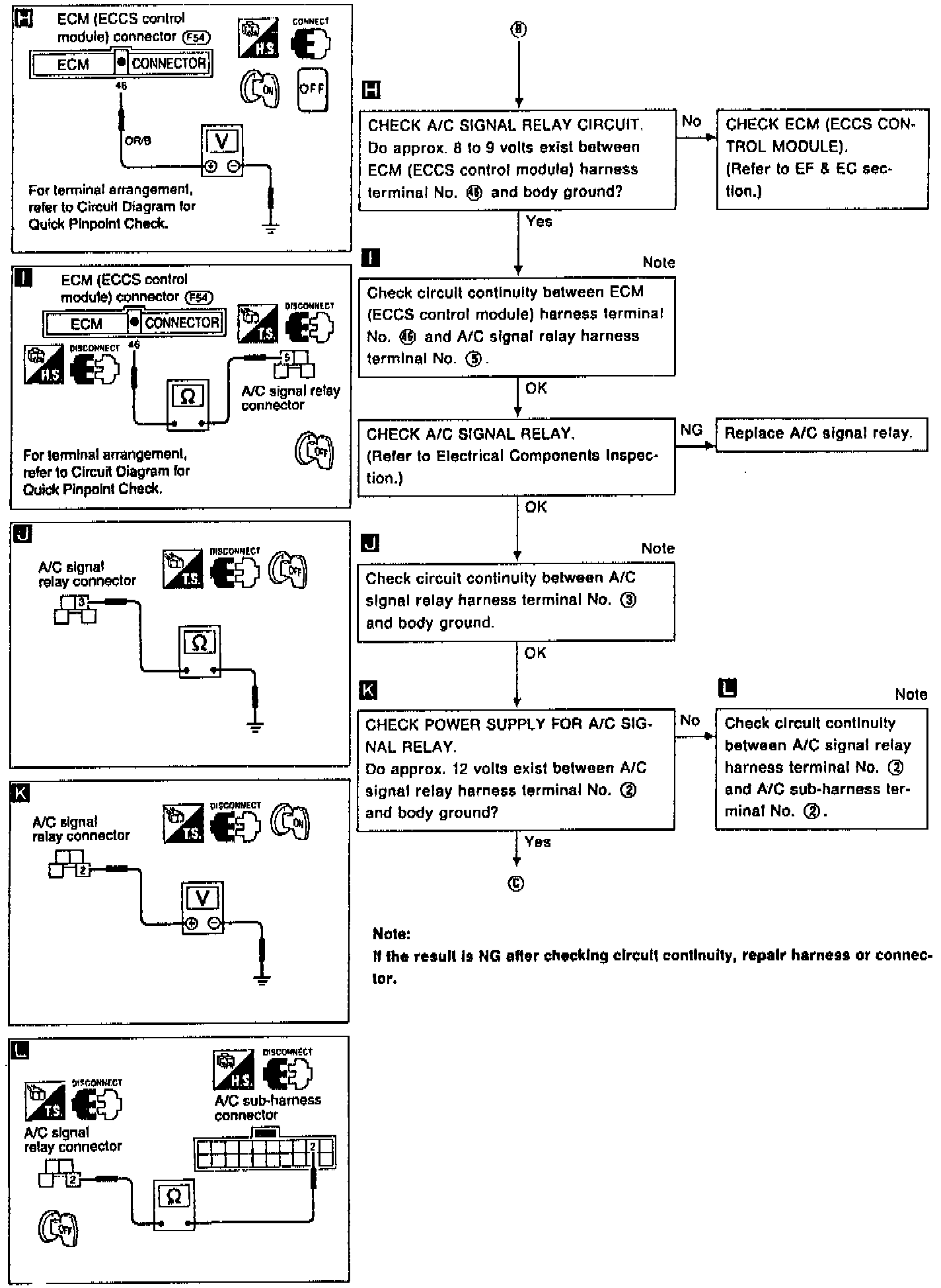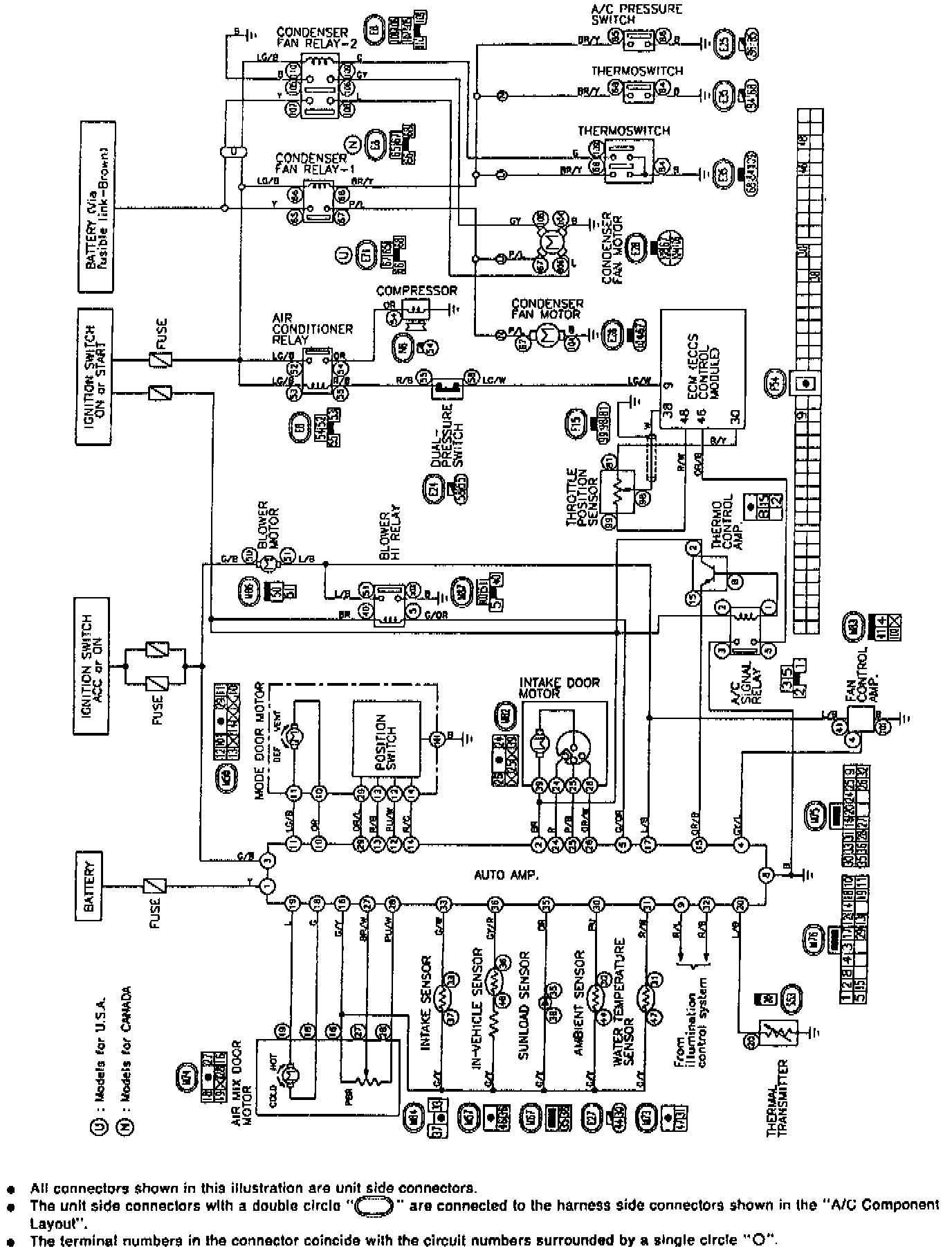 G5O models are equipped with a thermo control amp. to prevent evaporator icing. In addition, A/C signal relay is adopted to send A/C ON.OFF signal to the ECM (ECCS control module).