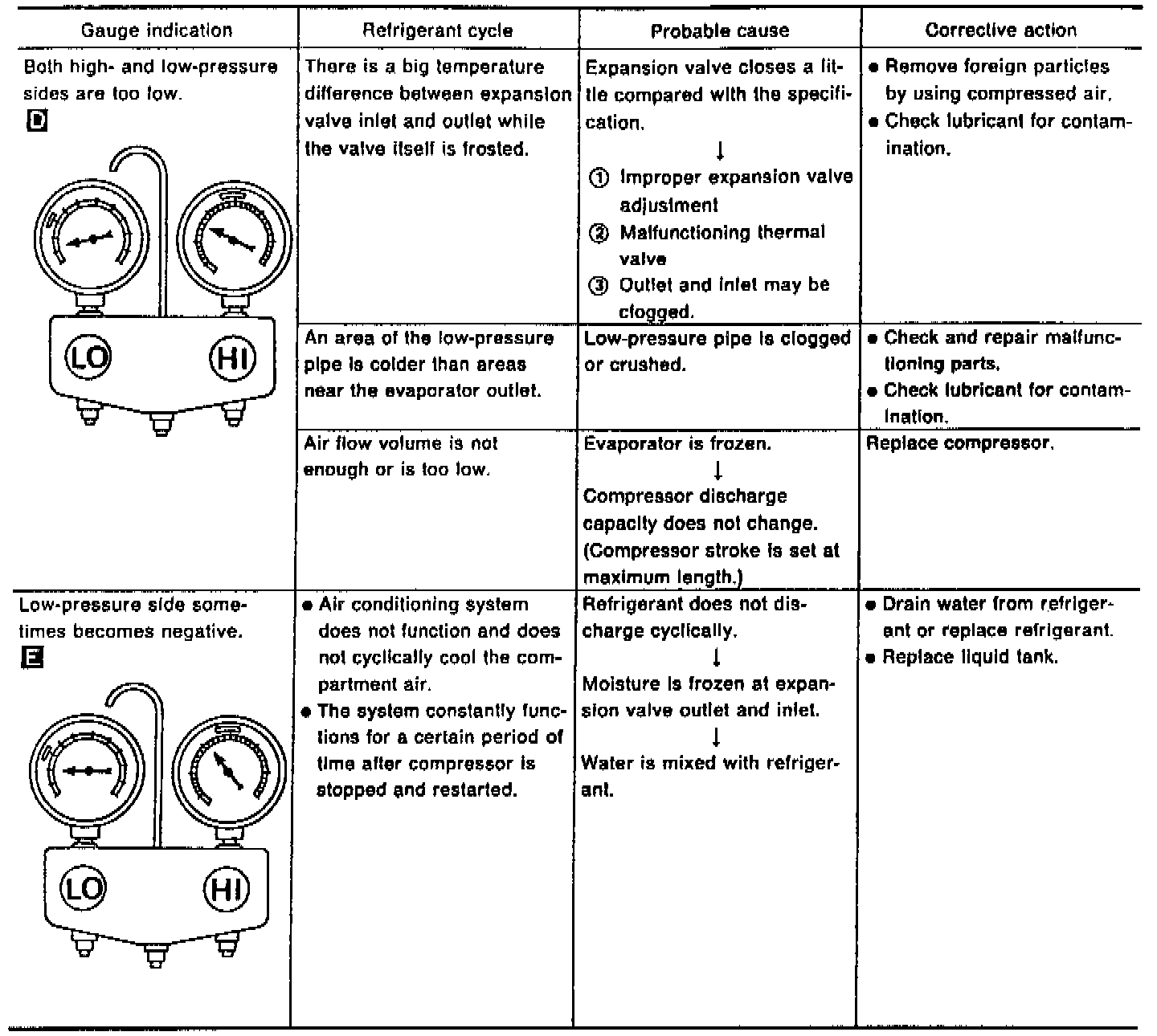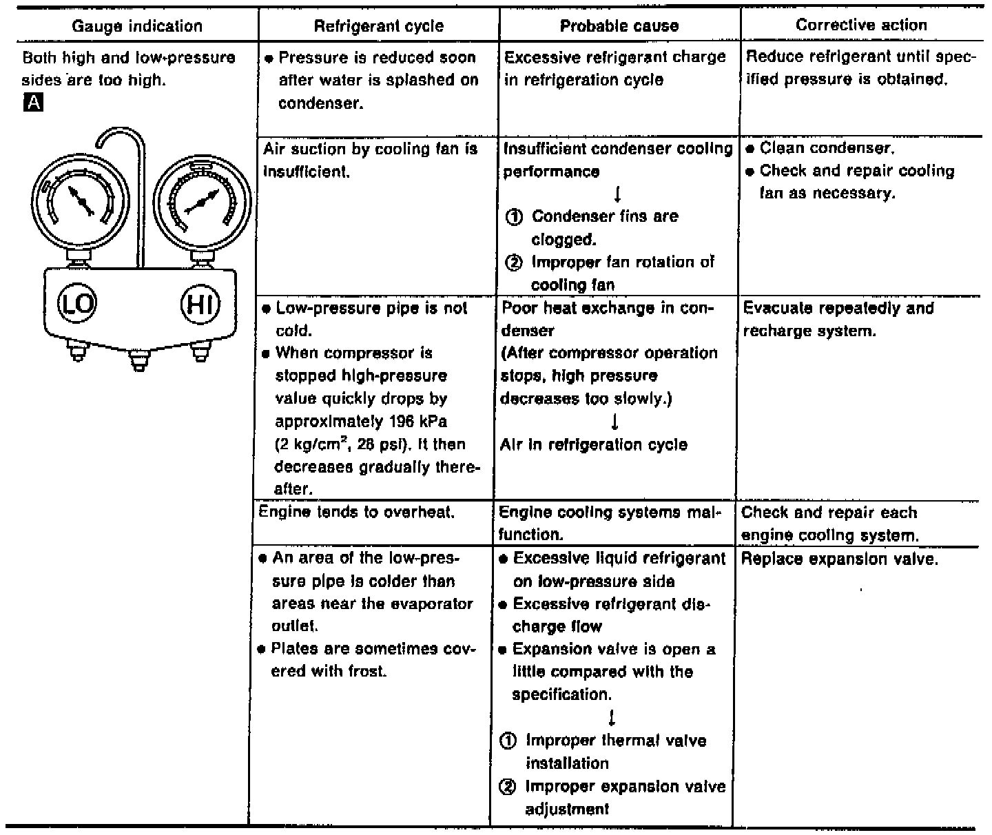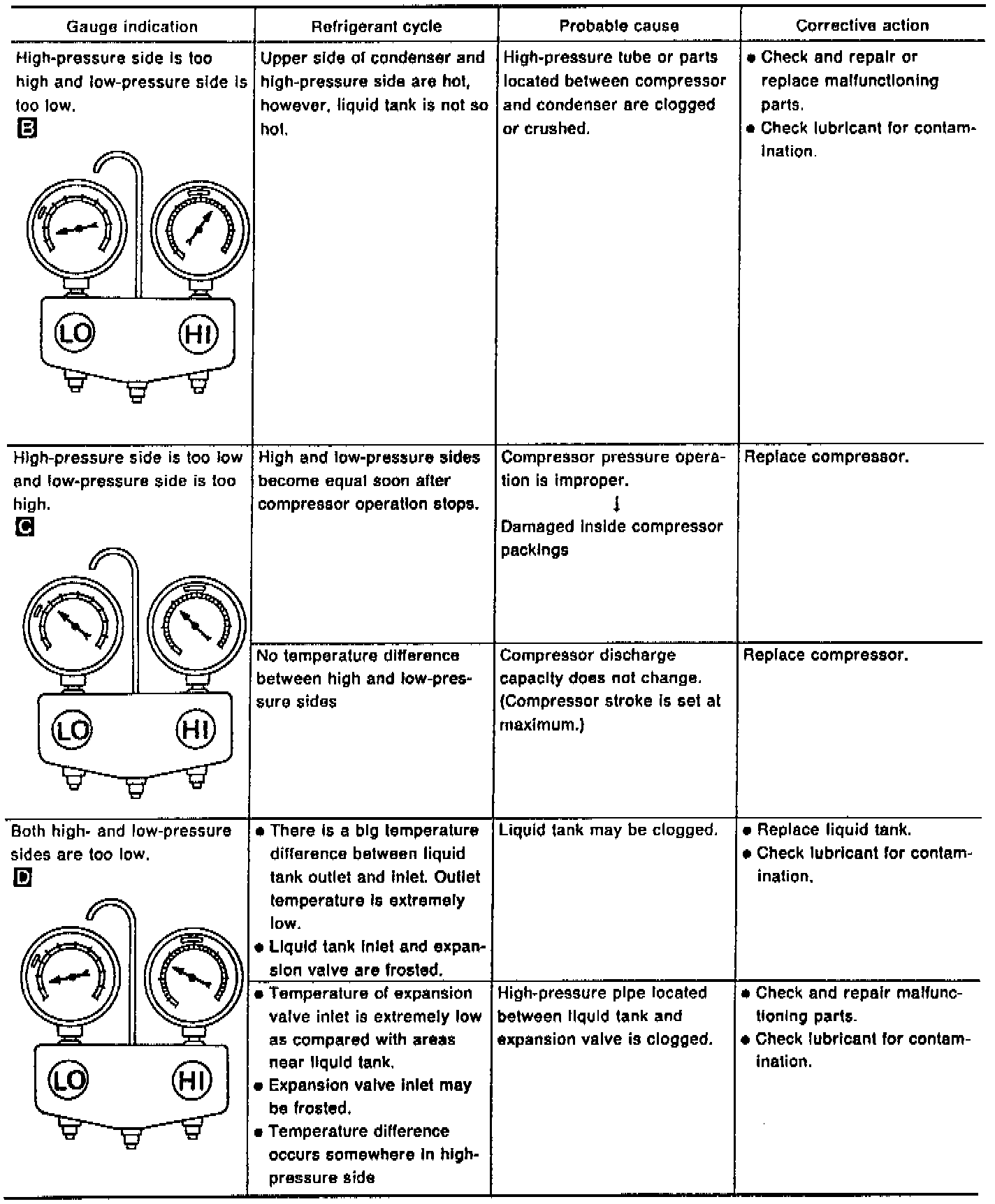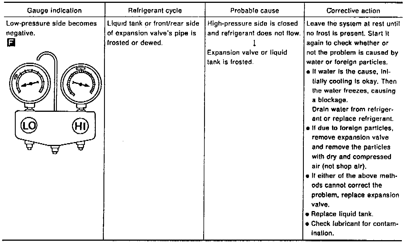 Whenever the high and/or low side pressure is abnormal, diagnose using a manifold gauge. The marker above the gauge scale in the following tables indicates the standard (normal) pressure range. Since the standard (normal) pressure, however, differs from vehicle to vehicle, refer to ("Ambient air temperature-to-operating pressure").