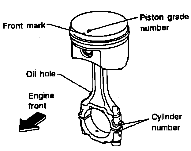 1. Install new snap ring on one side of piston pin hole, heat piston to 140-158°F and assemble piston, pin connecting rod and snap ring.