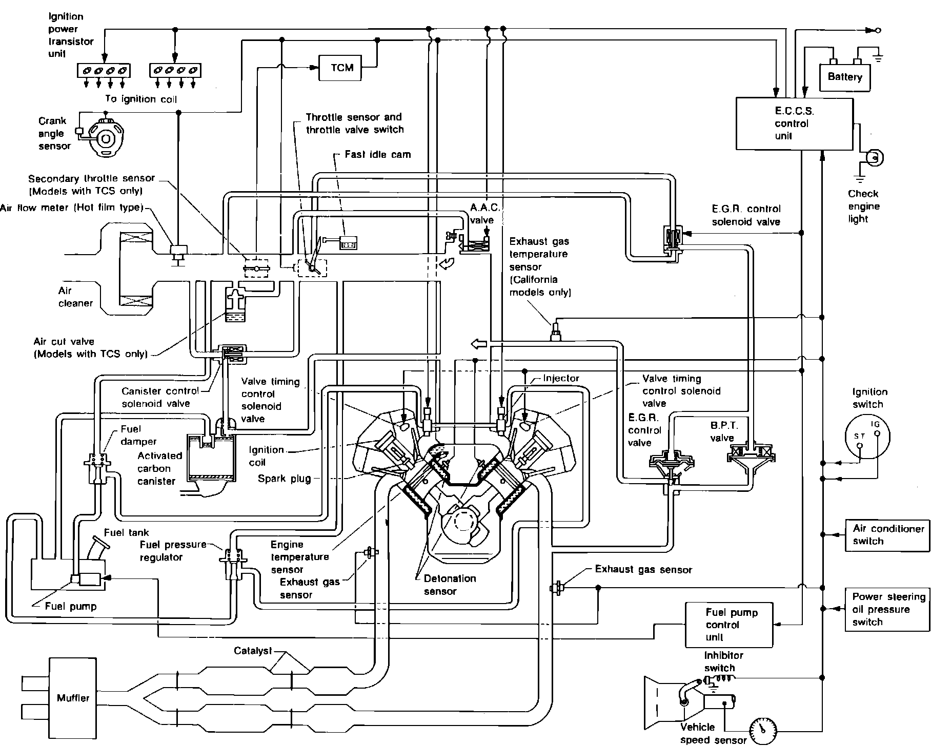 The Electronic Concentrated Control System (ECCS), Figs. 3, incorporates the fuel injection system and employs a micro-computer within the control unit. The micro-computer processes incoming signal data from engine and vehicle sensors and computes signal combinations to be sent to the electrical actuators.
